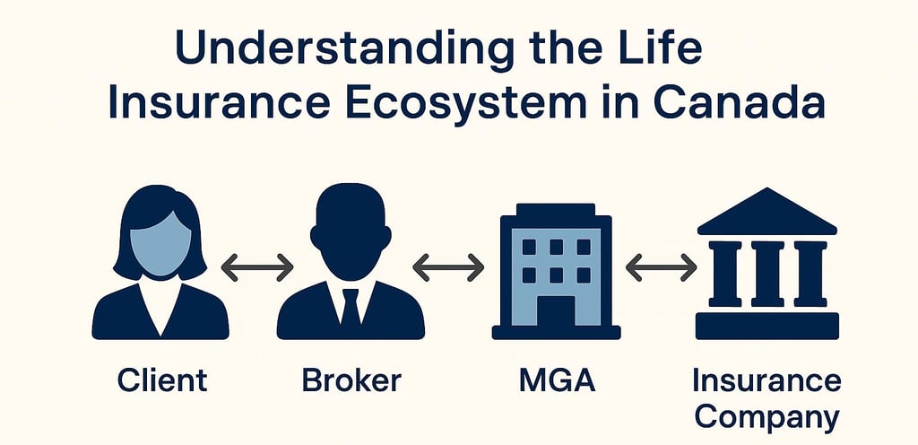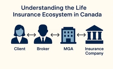 The overview - When you (The Client) work with a life insurance broker in Canada, you gain access to a wide range of life insurance companies and products. A good broker typically has contracts with multiple insurers through an intermediary called an MGA (Managing General Agency).